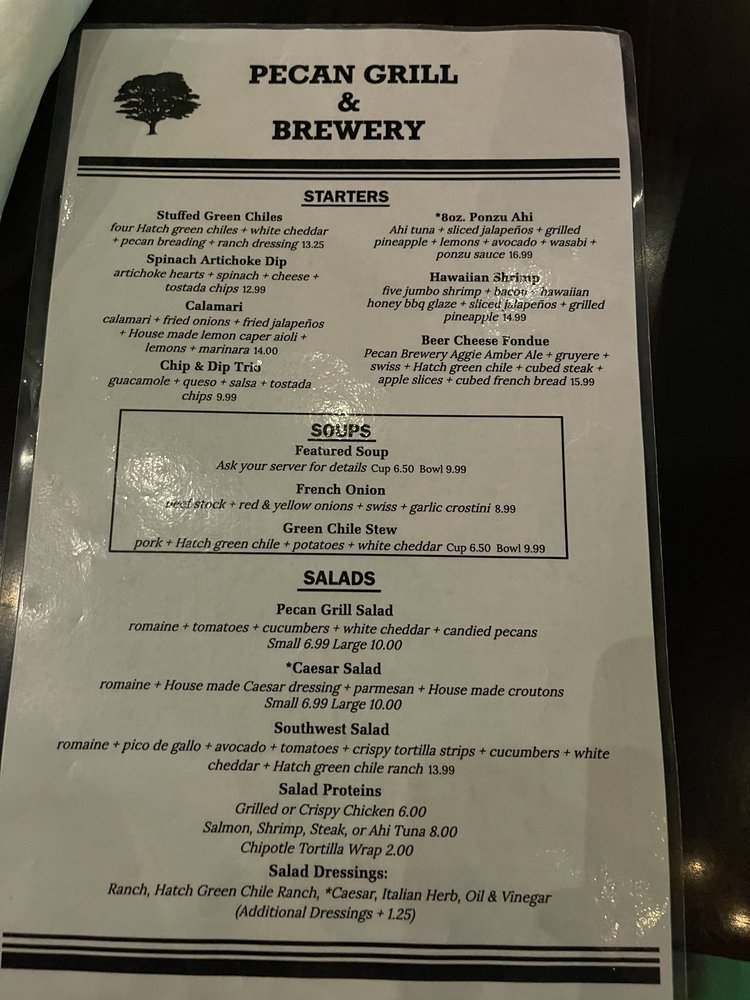 The menu boasts a variety of starters that include Stuffed Green Chiles and Ahi Tuna, offering intriguing flavors that entice your palate. For salad lovers, both the Pecan Grill Salad and Southwest Salad provide fresh, vibrant choices to complement any meal.